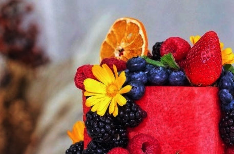 This beauty of a cake is made of nothing but the freshest fruits 💦 Juicy red watermelon blocks with cascading waterfalls of premium assorted berries on the front and back - and plenty more on the sides - this gorgeous two-tier "cake" is further elevated with dainty edible flowers for a pop of sunny colours. The rich jewel-like lustre of fresh blackberries, raspberries, blueberries, and strawberries make a mesmerising sight that'll bring joy to loved ones of any age!