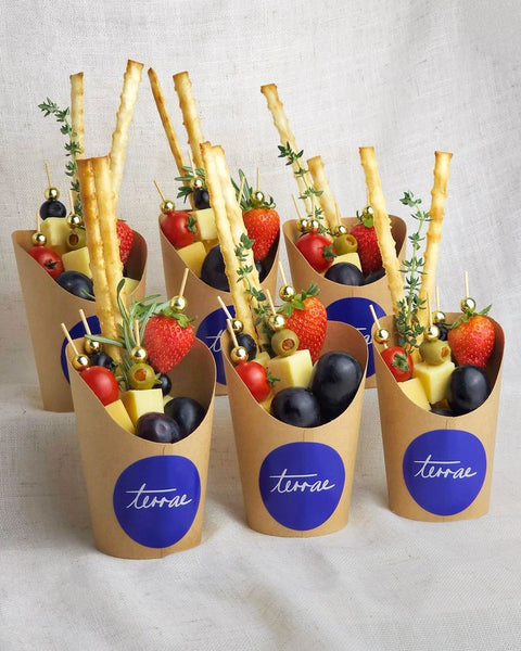 Splatter had the pleasure of serving sustainable activewear brand terrae on their Easy capsule collection launch. These fuss-free grazing cups were customised with a meat-free menu for the event.